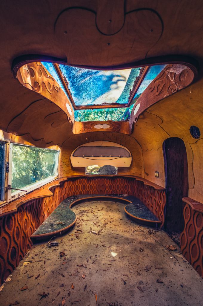 Not looking closer was a big mistake. The photo below taken by Todd Sipes (https://www.toddsipes.com) shows why. The remodel of the trailer was certainly, given the style, designed by Druid Heights resident Roger Somers and represents a major creative flight. This Airstream trailer’s traveling days may have been through once it arrived at Druid Heights but it could move the imagination of those who resided within.