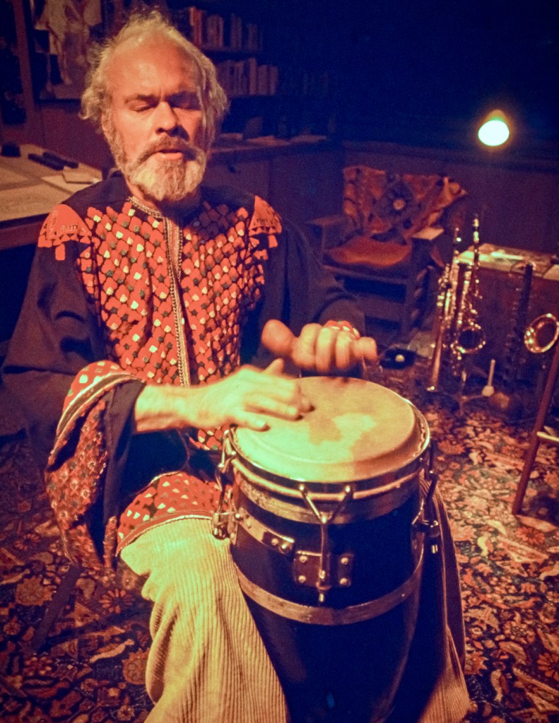 This early 1970’s photo captures Druid Heights original resident Roger Somers playing the conga. On the left and behind him are his drafting table and books on architectural subjects, while on the right are several of his other favorite instrument, the saxophone along with what appears to be a small Indian Sitar.