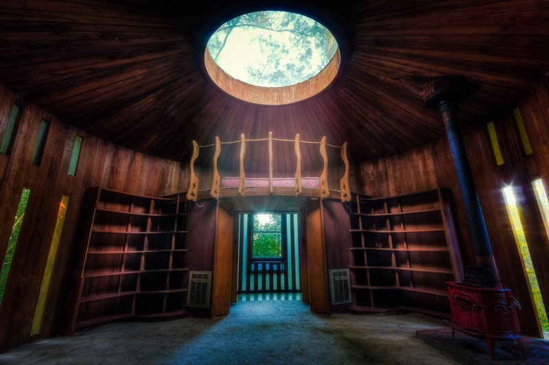 The photo below shows a broader view of the same room and was taken probably taken around the same time or not long afterwards. Sadly, this room is in terrible shape today, and would very likely need to be be rebuilt from the ground up if it was to be brought back to life. Other buildings at Druid Heights are in better shape but sliding towards the same fate unless steps are taken to, at a minimum, stop their decay.